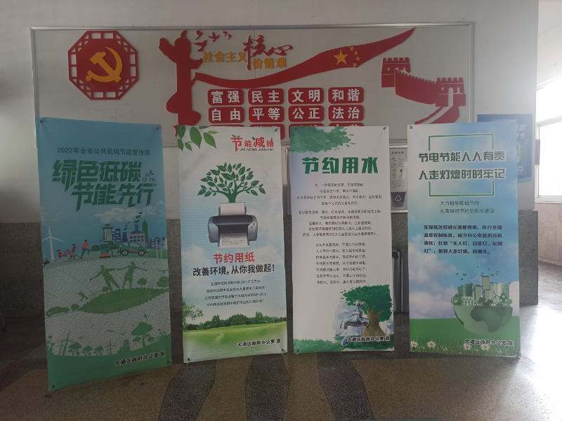 为传播节能降碳和绿色发展理念,倡导绿色低碳生活方式,区政府办在全国节能宣传周期间,通过政务信息大屏,循环播放国家机关事务管理局制作的《低碳生活系列宣传片》,并在区政府和区机关食堂设置节能降耗和反餐饮浪费展板,充分发挥公共机构在社会绿色低碳发展中的示范引领作用。