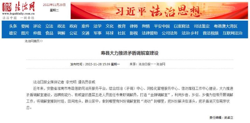 近年来,安徽省365网站是正规平台吗_bte365官网_365bet官网备用寿县借助司法所服务平台,结合综治(矛调)中心、网格化管理服务中心、信访维稳工作中心建设,大力推进矛盾调解室建设,选聘有能力、有威望的基层五老人员担任专兼职调解员,打造“金牌调解室”,利用乡音、乡俗、乡情为纽带开展调解工作,将调解室搬到村组、田间地头、群众家中,做到哪里有纠纷调解室就“流动”到哪里,把纠纷解决在源头,把矛盾消灭在萌芽状态。