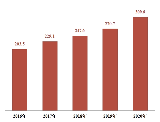 图2 2016-2020年田家庵区社会消费品零售总额(单位:亿元)
