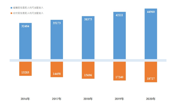 图4 2016-2020年田家庵区城乡常住居民人均可支配收入(单位:元)