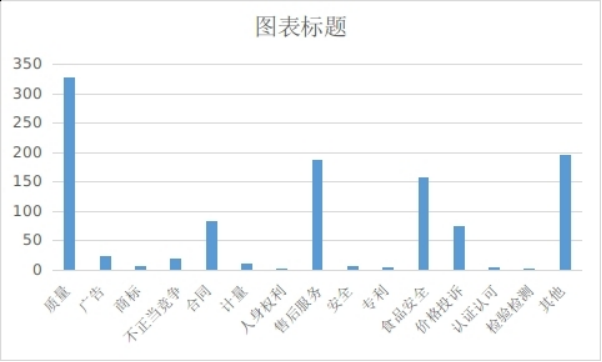 在受理的1106件投诉件中,商品消费件821件,服务消费件285件。属于质量问题329件,占比29.75%;属于其他问题197件,占比17.81%;售后服务187件,占比16.90%;属于食品安全问题159件,占比14.38%;属于合同问题84件,占比7.60%;属于价格投诉问题75件,占比6.78%;属于广告问题24件,占比2.16%;属于不正当竞争19件,占比1.72%;属于计量问题11件,占比0.99%;属于安全问题8件,占比0.72%;属于商标问题7件占比0.63%;属于认证认可问题2件,占比0.01%;属于专利问题2件,占比0.01%;属于检验检测问题1件,占比0.009%。