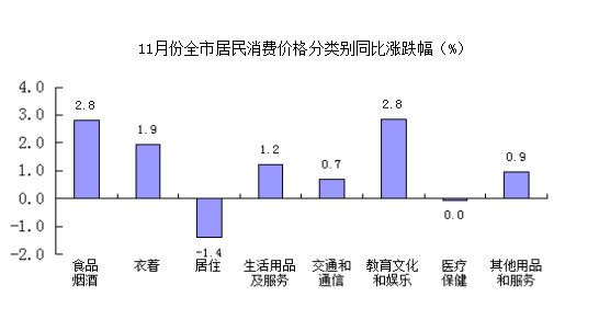 分类别看,11月份,八大类商品和服务价格六升一降一持平,其中,食品烟酒价格同比上涨2.8%,衣着价格上涨1.9%,居住价格下降1.4%,生活用品及服务价格上涨1.2%,交通通信价格上涨0.7%,教育文化娱乐价格上涨2.8%,医疗保健价格持平,其他用品及服务价格持上涨0.9%。在食品烟酒价格中,猪肉价格上涨26.3%,水产品价格下降2.8%,粮食价格上涨4.3%,鲜果价格上涨17.9%,鲜菜价格下降31.0%。