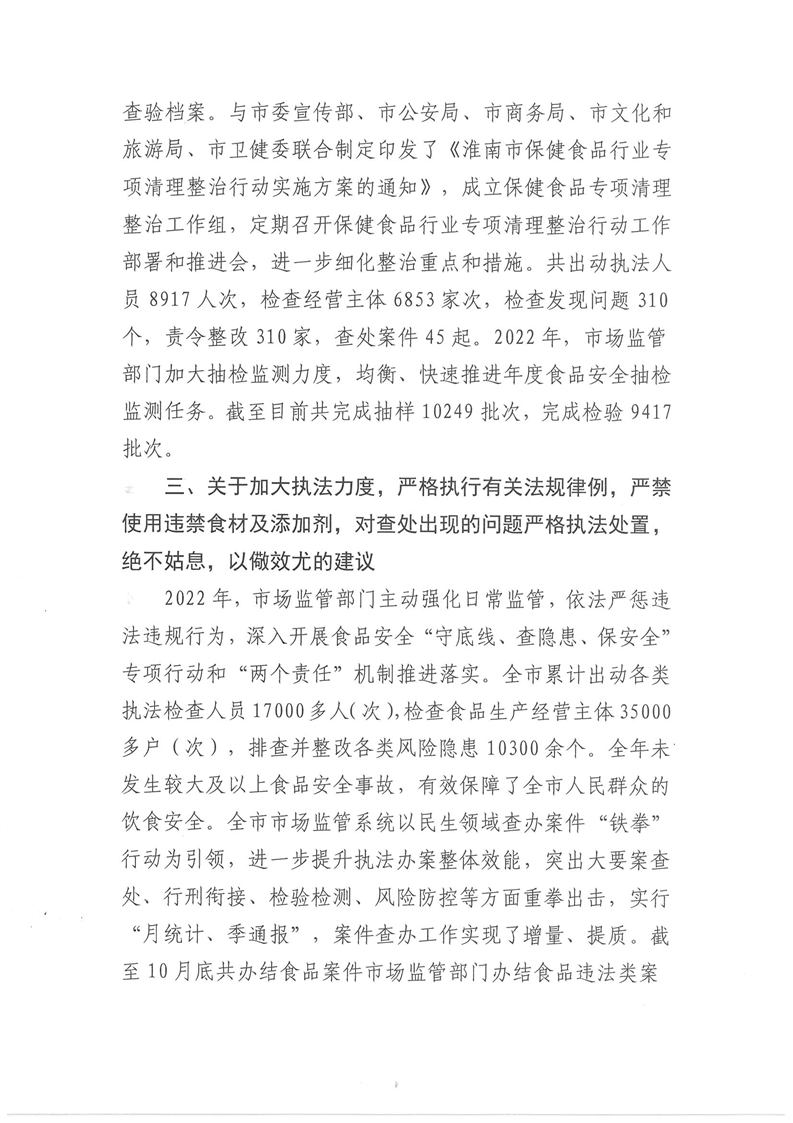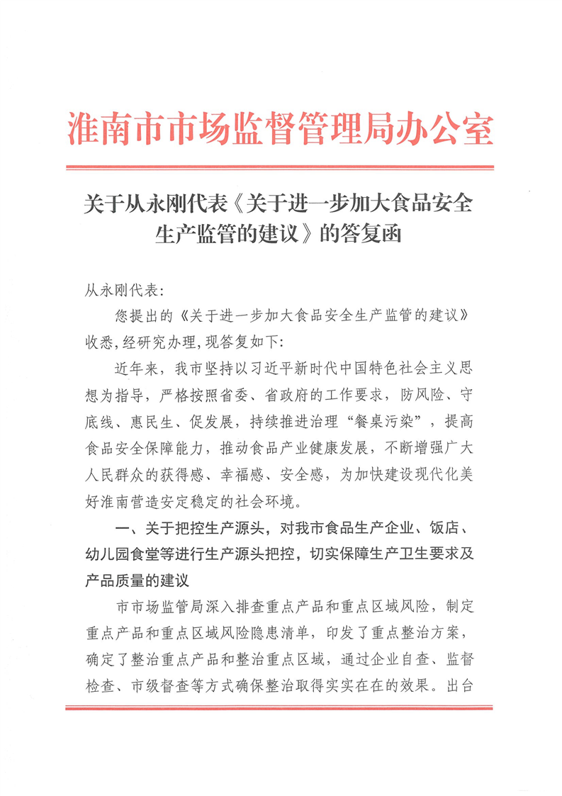 关于从永刚代表《关于进一步加大食品安全生产监管的建议》的答复函